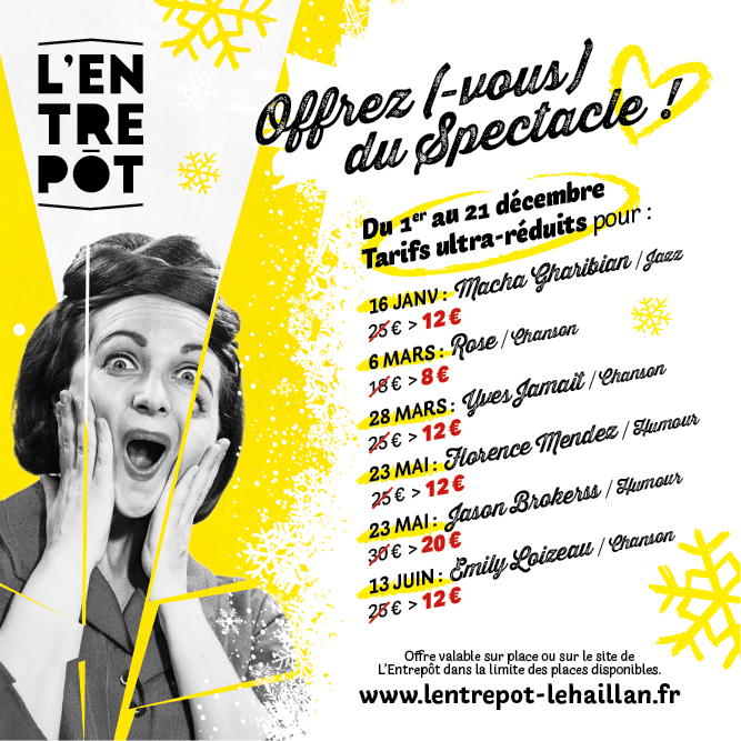 Offre valable sur place ou sur le site de L’Entrepôt dans la limite des places disponibles (le tarif de Noël s’affichera au moment du choix du tarif).